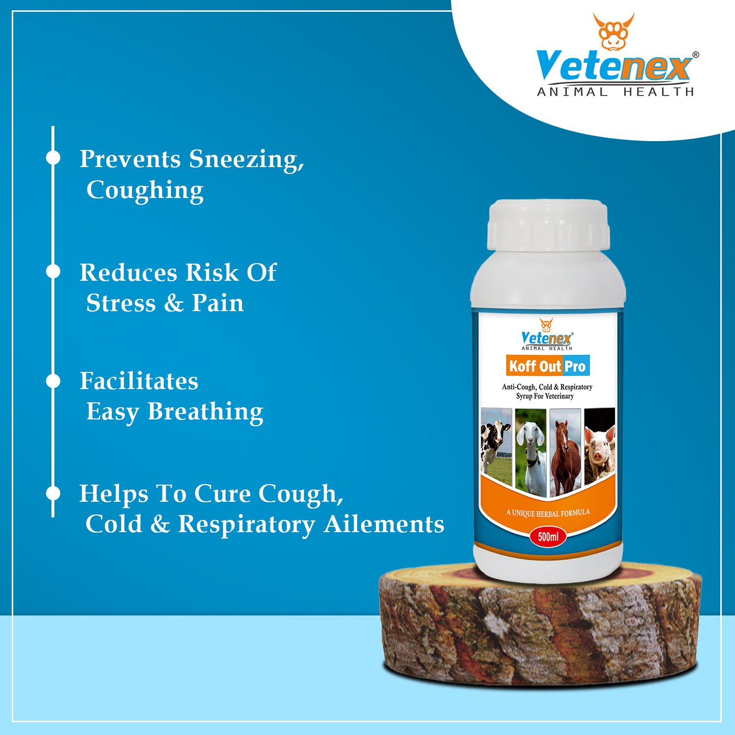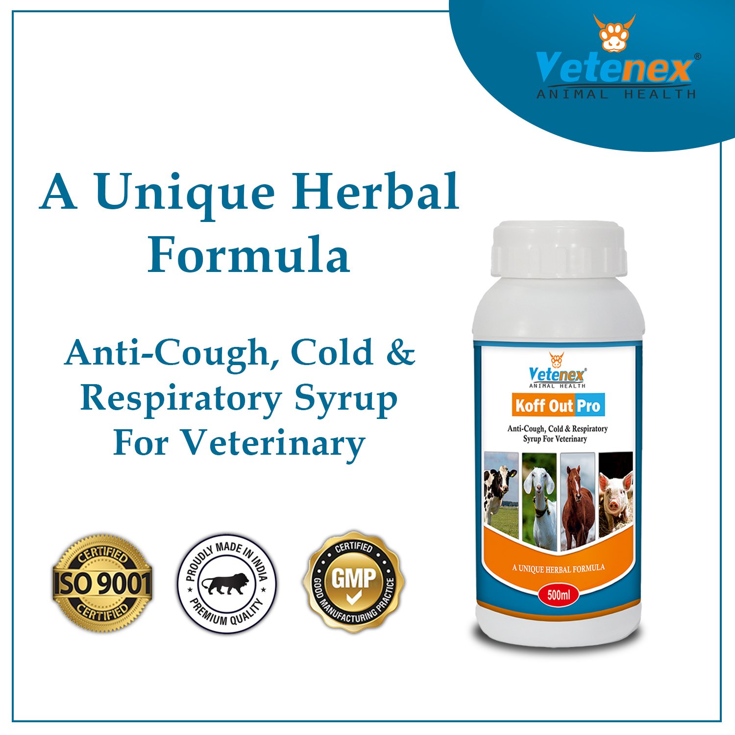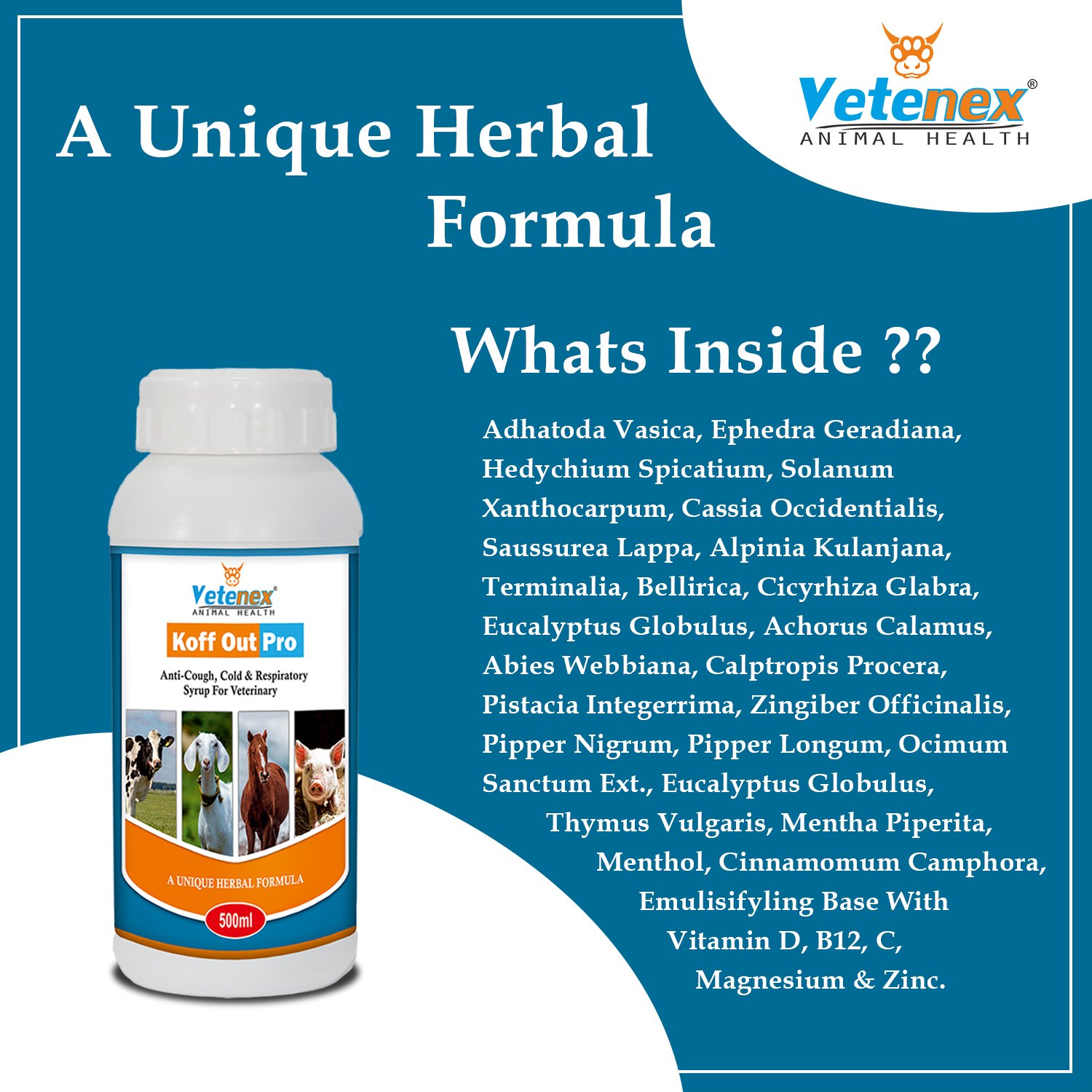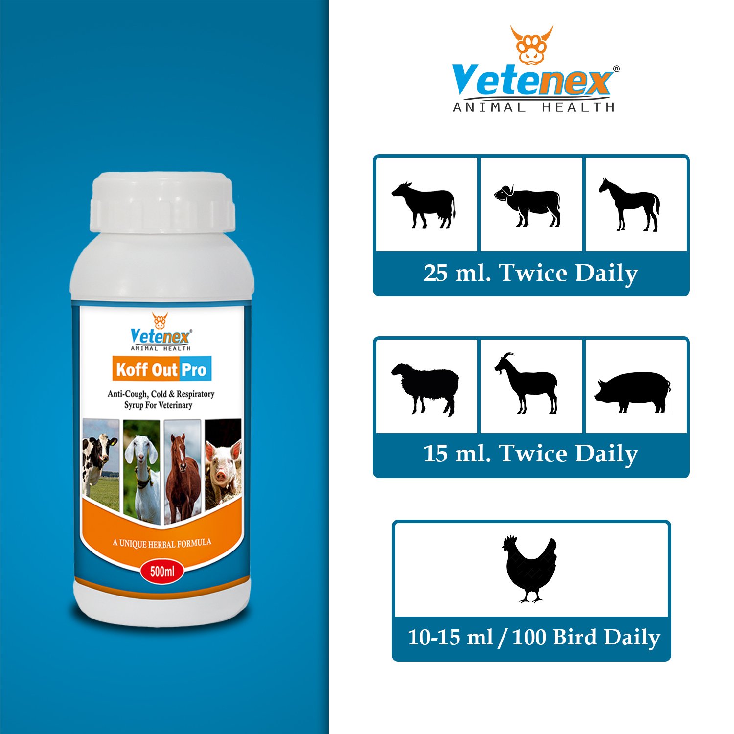 VETENEX Koff Out Pro – Anti-Cough, Cold & Respiratory Herbal Tonic for Cattle, Cow, Buffalo, Goat, Pig, Sheep & Livestock Animals. Its Helps to Cure Cough, Cold & Respiratory Ailments and Also Control Respiratory Symptoms in CRD, Infectious Coryza etc. It Prevents Sneezing, Coughing & Labored Breathing