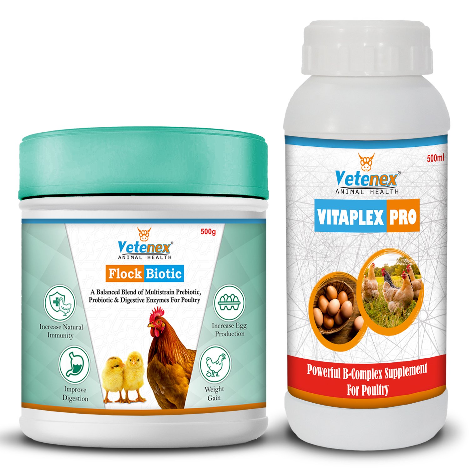 Original price was: ₹2,698.00.₹1,998.00Current price is: ₹1,998.00.VETENEX Prebiotic, Probiotic & Enzyme Supplement + Vitamin B Complex Supplement, Growth Promoter for Poultry, Birds & Chicken (500gm+500ml) – Combo Pack of 2