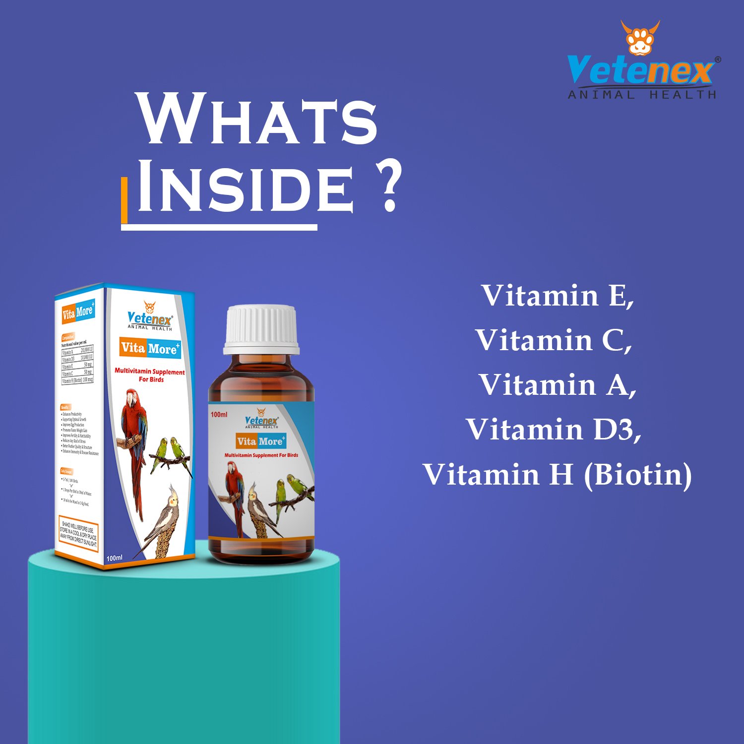 VitaMore Plus is an Effective Multivitamin Liquid supplement for All Birds & Pegions. It Increase Growth, Weight Gain, Egg Production, Eggshell Quality & Enhances Immunity & Disease Resistance.
